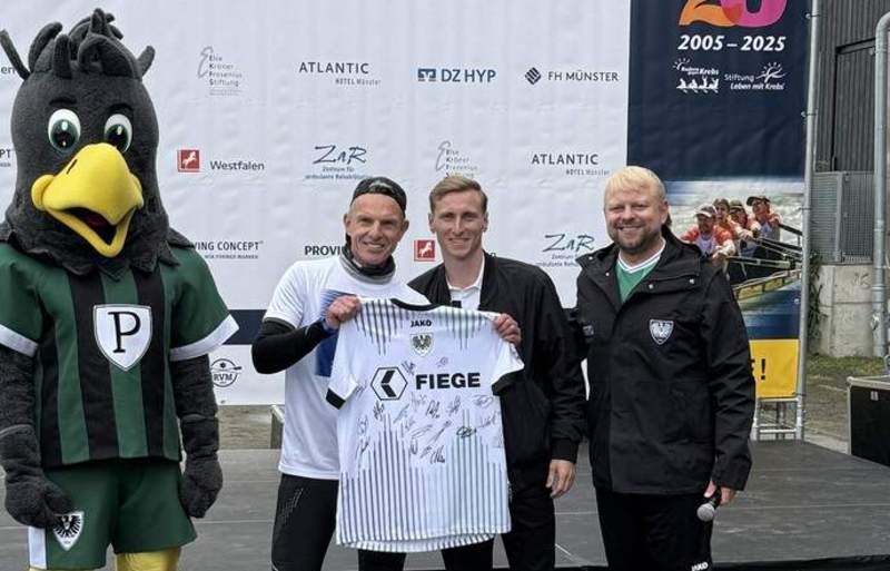 Im Mittelpunkt der Regatta standen nicht nur der sportliche Ehrgeiz, sondern vor allem das Miteinander und das gemeinsame Ziel, Krebspatientinnen und -patienten Mut zu machen. Ob auf dem Wasser oder am Ufer – überall war die Begeisterung und das Engagement der Teilnehmenden spürbar. Das bunte Rahmenprogramm, kulinarische Angebote und zahlreiche Mitmachaktionen sorgten für beste Stimmung bei allen Beteiligten. Überraschungsgast war Preußen-Spieler Joshua Mees, der fleißig Autogramme schrieb. Auch Fiffi, das Maskottchen der Adlerträger, war ein beliebtes Fotomotiv. Die Versteigerung zweier unterschriebener Preußen-Trikots brachte insgesamt 1200 Euro an zusätzlichen Spendeneinnahmen.