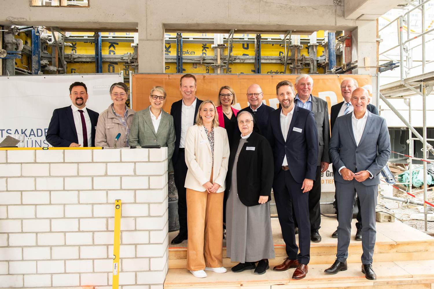 Dr. Nils Brüggemann, Vorstandsvorsitzender der Franziskus Stiftung, unterstrich in seiner Begrüßung: „Mit der neuen Franziskus Gesundheitsakademie bündeln wir die Ausbildung mehrerer Krankenhäuser der Region an einem zentralen Standort im Herzen von Münster. Die Akademie wird moderne, praxisnahe Lehre in Gesundheitsberufen bieten und mit einem Simulationszentrum realitätsnahe Trainings ermöglichen.“ Künftig würden hier 630 attraktive Ausbildungsplätze angeboten. Julia Swienty, Kaufmännische Direktorin der Franziskus Gesundheitsakademie (FGA), hob die Bedeutung des Campus als Ort der Begegnung hervor: „Von Anfang an war uns wichtig, dass es sich um einen Campus handelt, der genauso Raum für Bildung wie für Begegnung schafft. Dies ist fester Bestandteil des Gesamtkonzeptes, das wir in enger Abstimmung mit der Stadt Münster und der Erlöser-Kirchengemeinde umsetzen.“